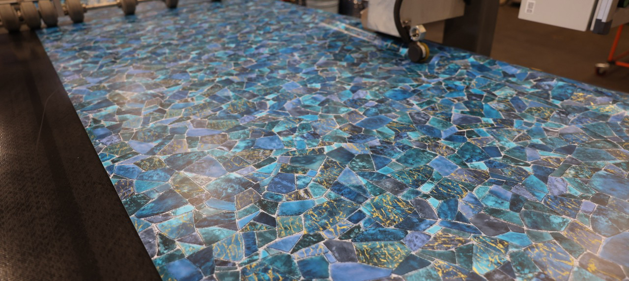 The base PVC is run through a large printer to apply the pattern. The ink and UV coatings used are formulated to bond with the vinyl and hold up against years of sunlight and pool chemicals.